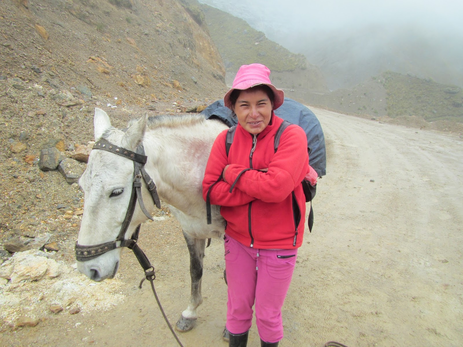 With Yanama sitting at around 3500 metres we had a reasonably cool night and it was still pretty cool when we set off on todays walk. Today was the crux of the whole trek as we had to climb Yanama pass, which at 4660 metres would be the highest spot on the walk. Yanama is now connected to the outside world by a rough dirt road and over the course of the day we spent a fair bit of time walking it, in-between the road sections a walking track short-cut some of the big switch backs, inevitably this meant that the gradient would ramp up a bit. The climb up to the pass was actually a lot easier than I expected, yeah I would get a little short of breath if I went too hard, but if I just chugged along I was fine and I suffered no ill affects from the altitude. The scenary was very rural initially but as we climbed we got into some barren windswept puna, as we started through the alpine grassland the weather, which had been deteriating as we climbed, finally closed right in. Unfortunately we didn't get any far reaching views from Yanama Pass today, we managed a couple of quick snaps in the swirling mist but we really didn't hang around too long. Leaving the pass we started our long descent to Tortora, initially we dropped down steeply short cutting the road, the rain was now getting heavier and we were happy to eventually see our lunch tent materialise out of the mist. After our late lunch we continued on in worsening weather, at the same time we were losing height quickly, by the time we arrived at our camp in Tortora it was pissing down, but that was all right because it made for a good excuse to crawl into the sleeping bag and relax a little before dinner.