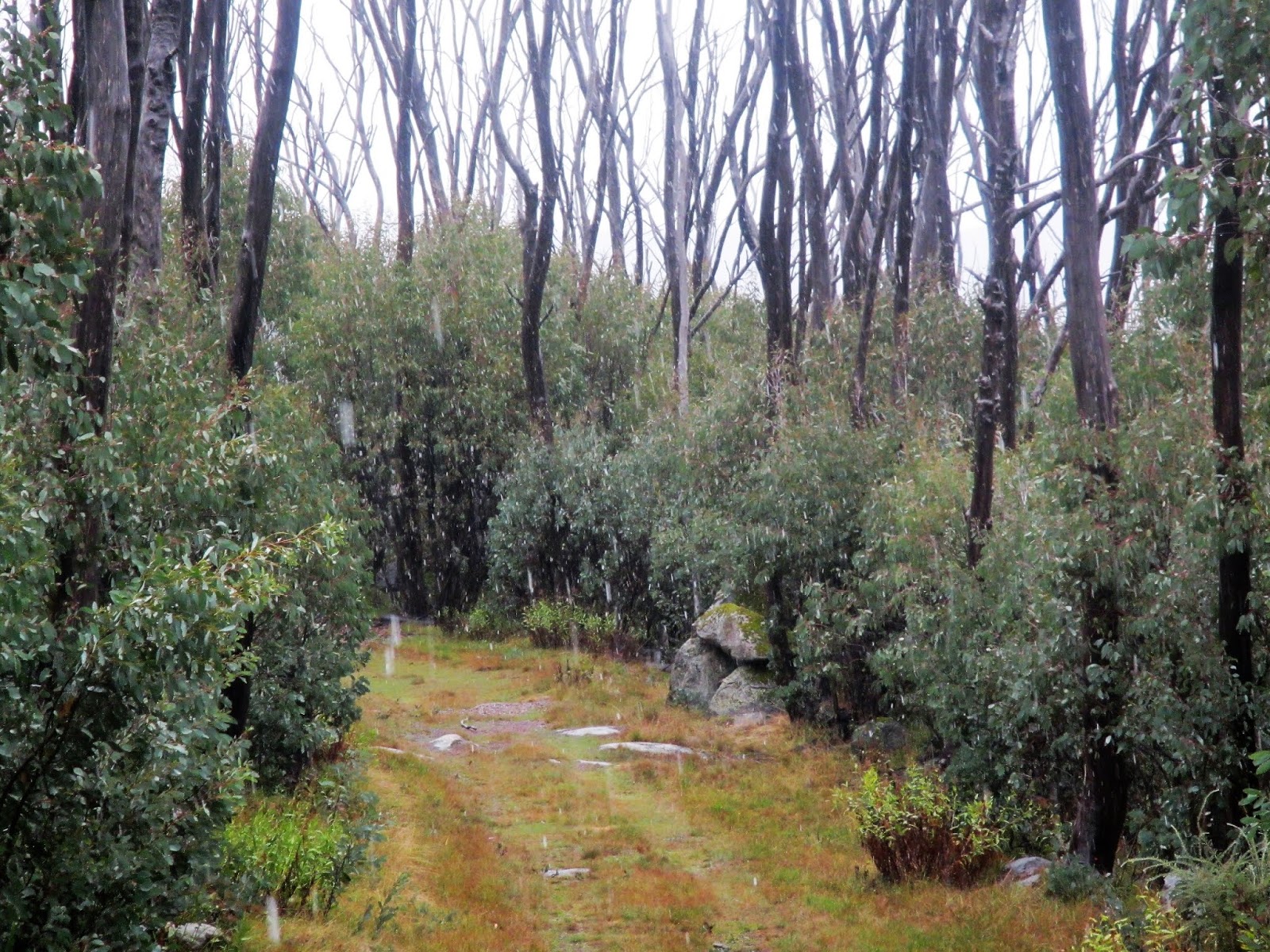 Muster Trail largely parallels Echo Flat Trail a little further to the west on the Lake Mountain Plateau and was pretty easy and slightly shorter way to finish up my walk. The weather was now deteriorating a bit more and as I dropped back down towards Gerratys I walked through the heaviest snow flurry of the walk. Not that the weather was worrying me much now, I wasn’t far away from the warmth of the ute and the walking down here was actually pretty good for the most part, Muster Trail heading down past some nice granite boulders and across the headwaters of the Taggerty River which drains Echo Flat.