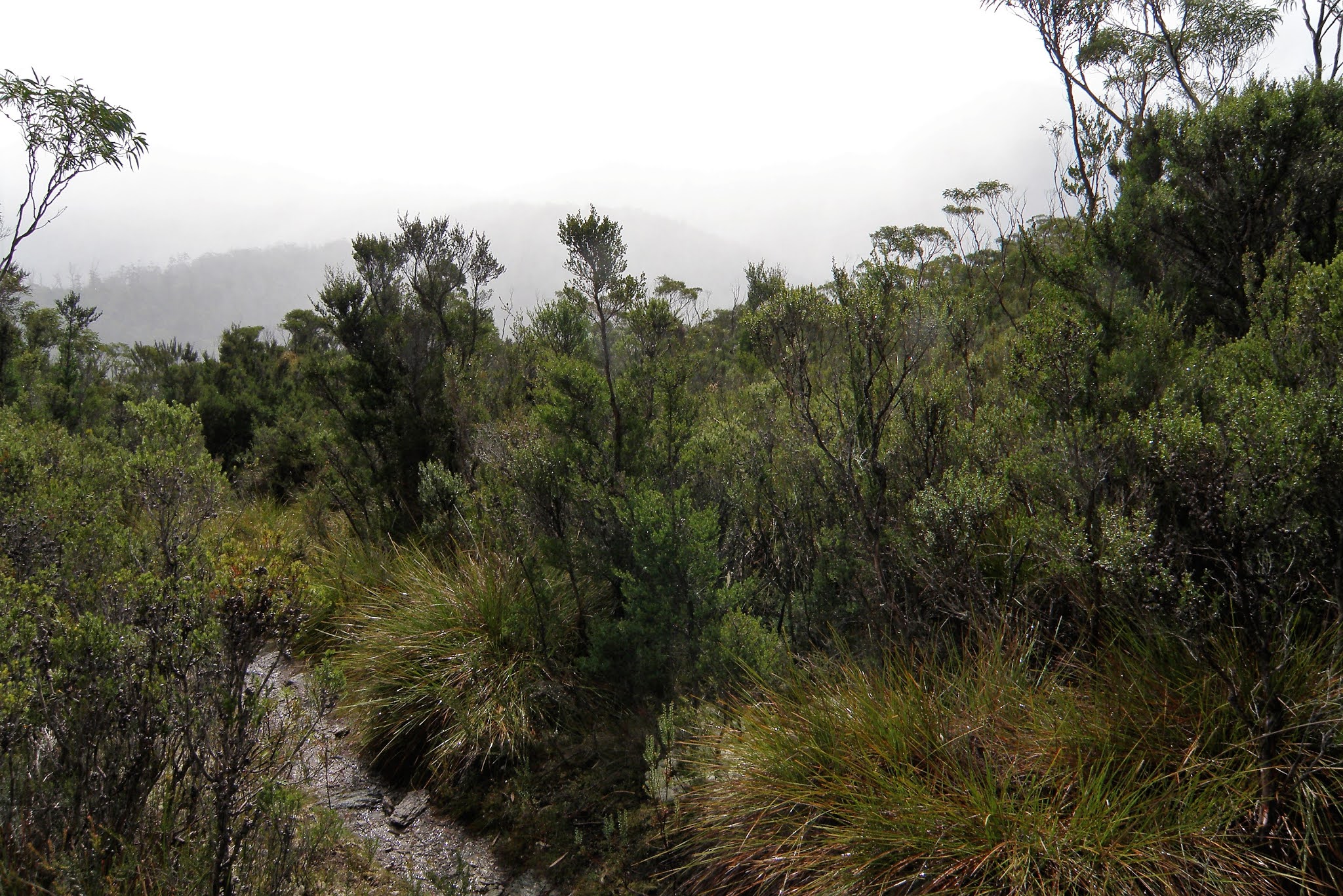 Leaving Paddys Lake the side trip to Black Bluff was quickly ruled out and I set about getting across the Black Bluff Range. The PCT across the tops is staked and the visibility was OK, so I just kept my head down and ticked off the kilometres. About 30 minutes after leaving Paddys Lake I was at Duff Creek where I grabbed a drink and some food, just before arriving there I had crossed over the highest point on the track at just over 1200m. The tops are fairly flat however walking is still slower than normal due to having to push through low alpine scrub along with the occasional boggy sections, still with nothing in the way of any views on offer I was making pretty good progress.