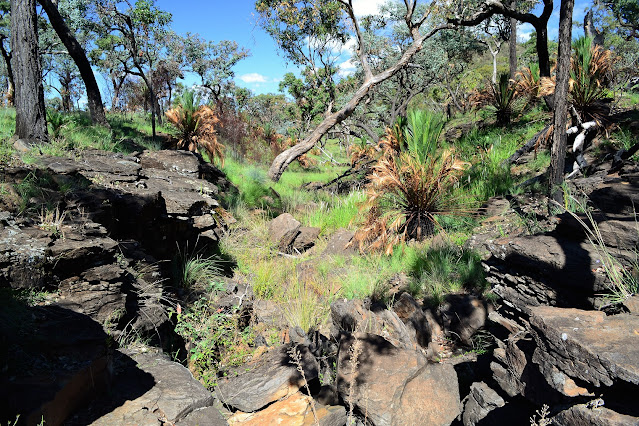 Crossing one small creek I spied a small spring with some crystal clear water in it, a little later I passed a couple more wet spots that looked like they may be springs, however the pigs had been wallowing in them and they were now a muddy mess. There are a series of springs through the country that the indigenous people and then the stockmen use to to rely on. Right on lunch time I met up with the management track that crosses the park. I'd now finished most of my climbing and was in a beautiful spot called the Mahogany Forest, a very lush place with tall silvertop stringybark and Sydney blue gum, with a groundcover of cycads and ferns.